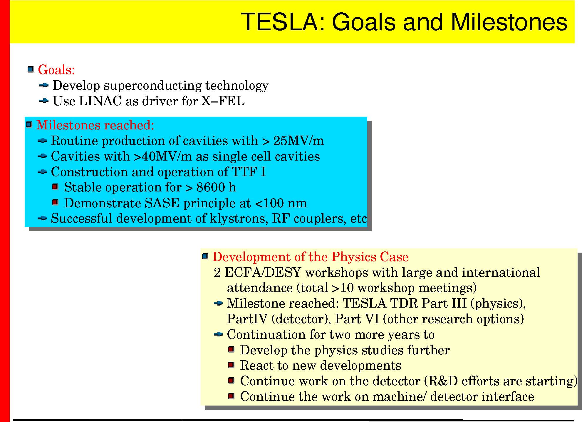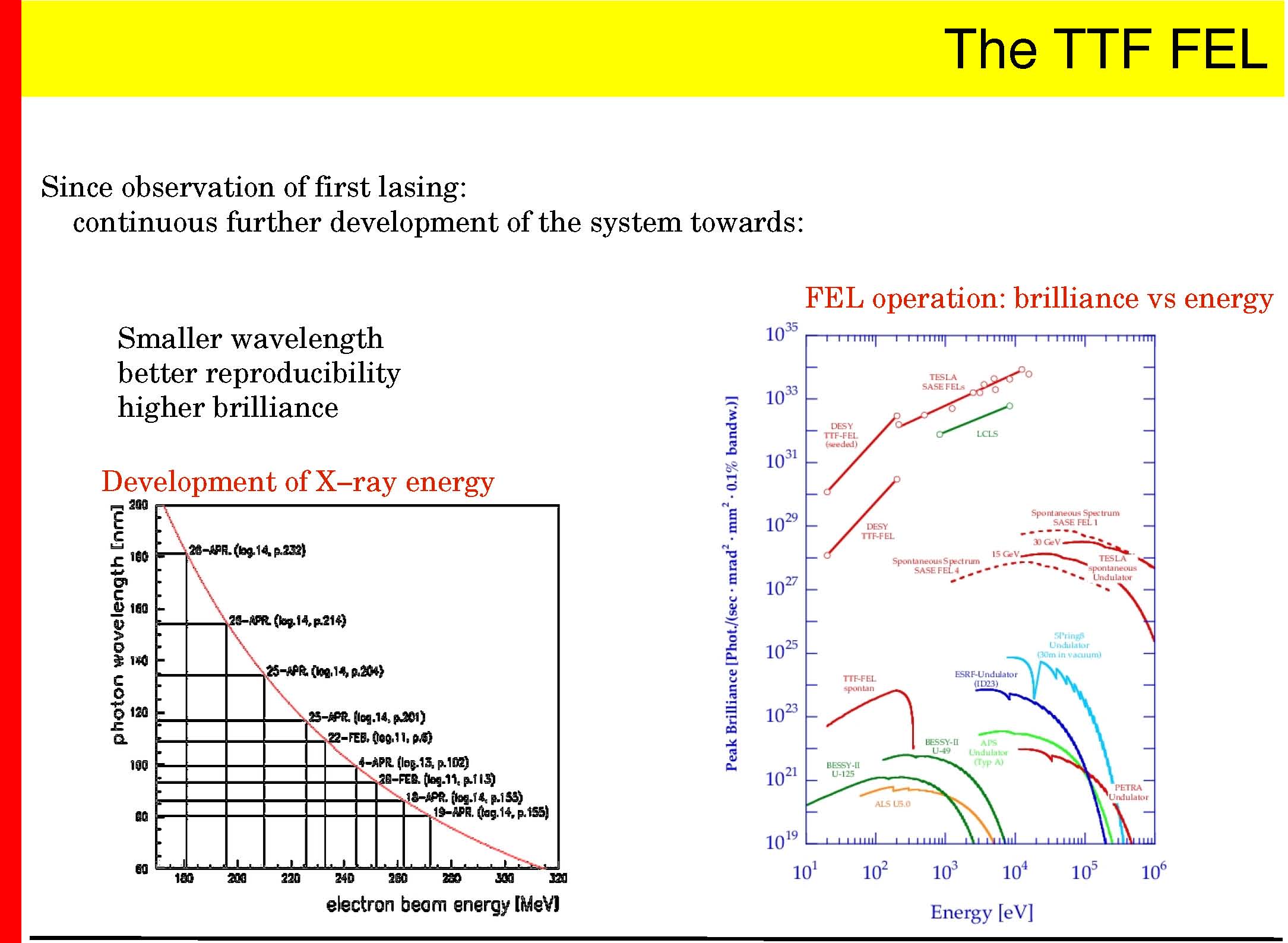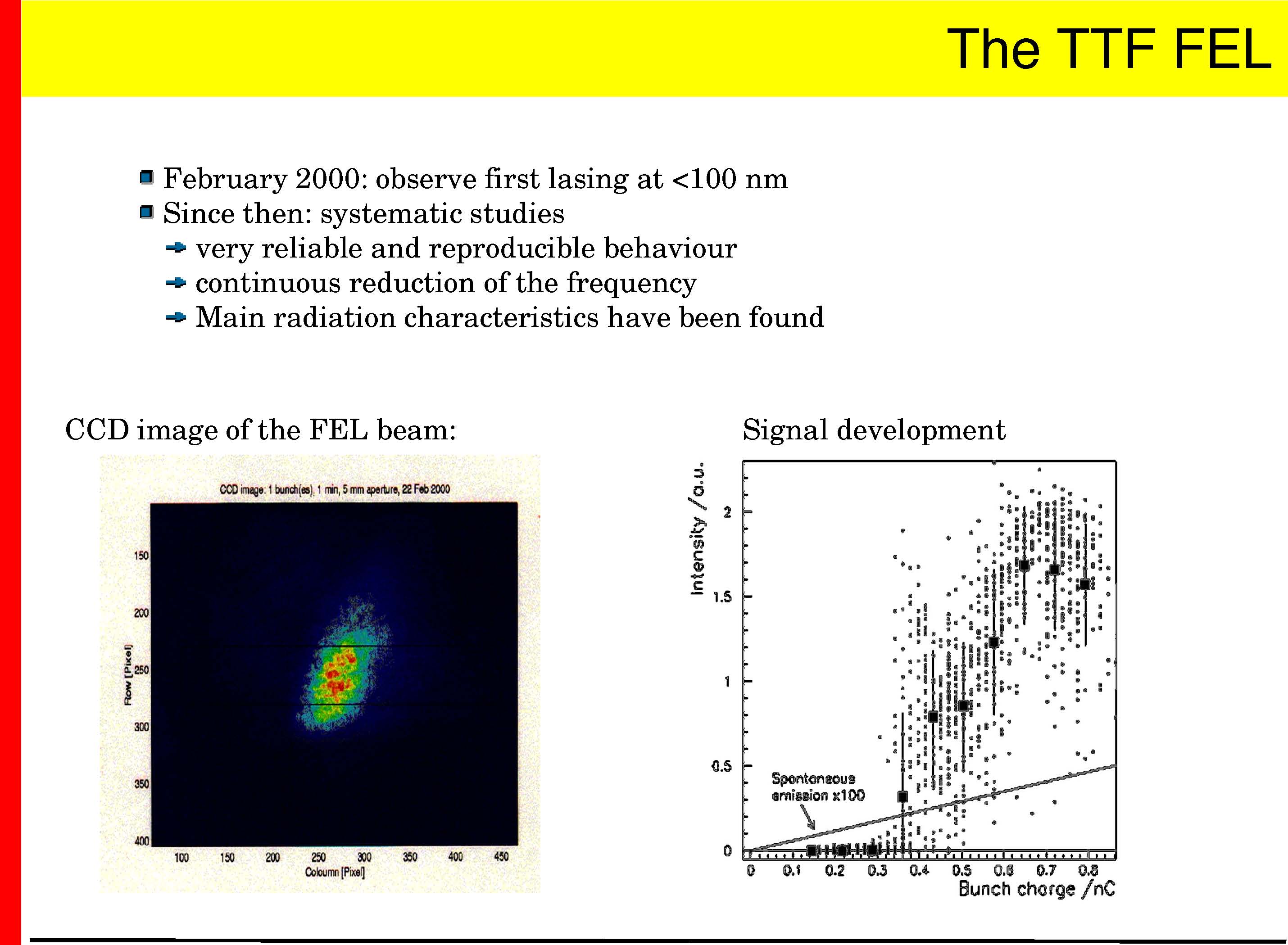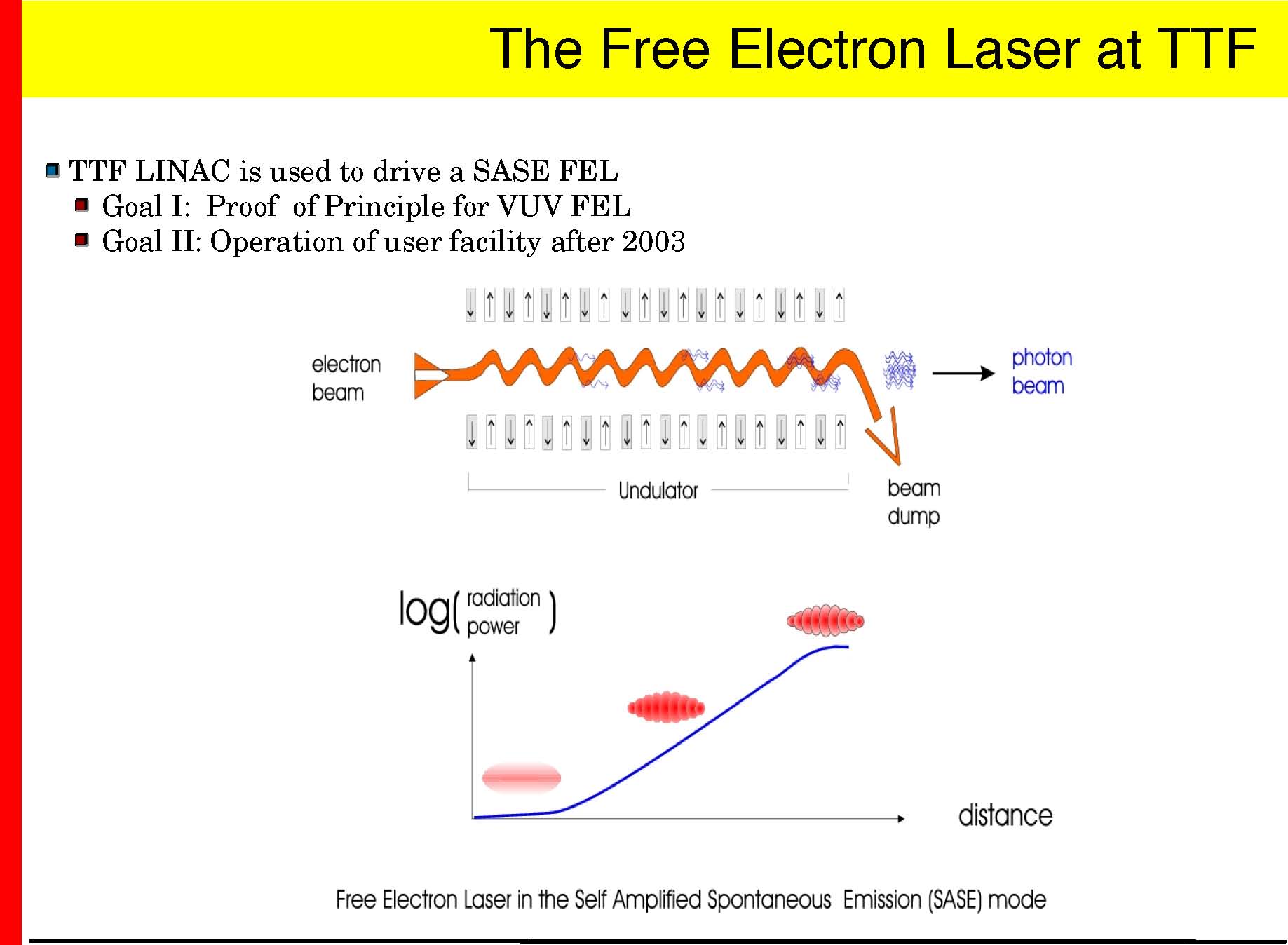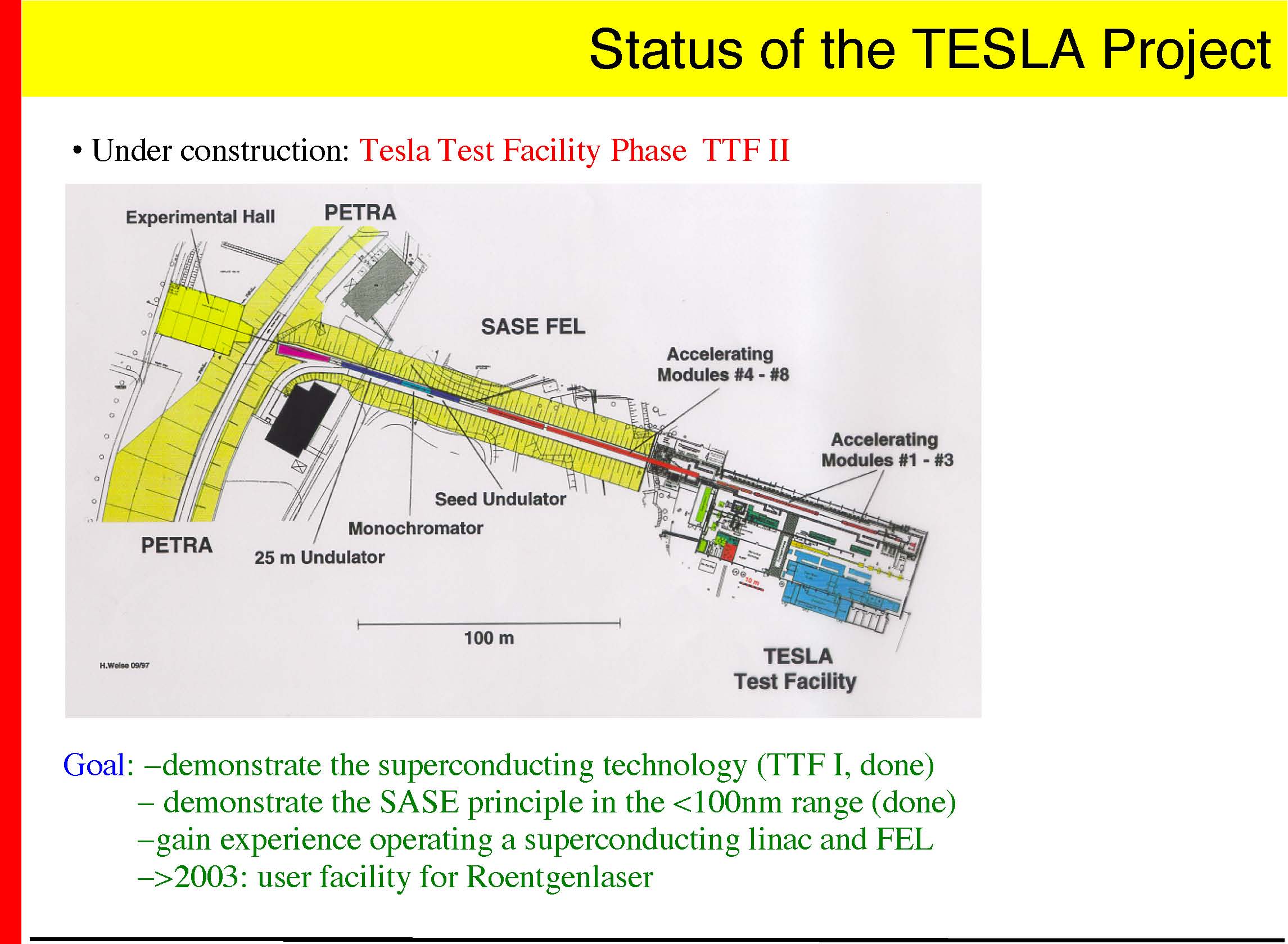 Goal: −demonstrate the superconducting technology (TTF I, done) − demonstrate the SASE principle in the <100nm range (done) −gain experience operating a superconducting linac and FEL −>2003: user facility for Roentgenlaser