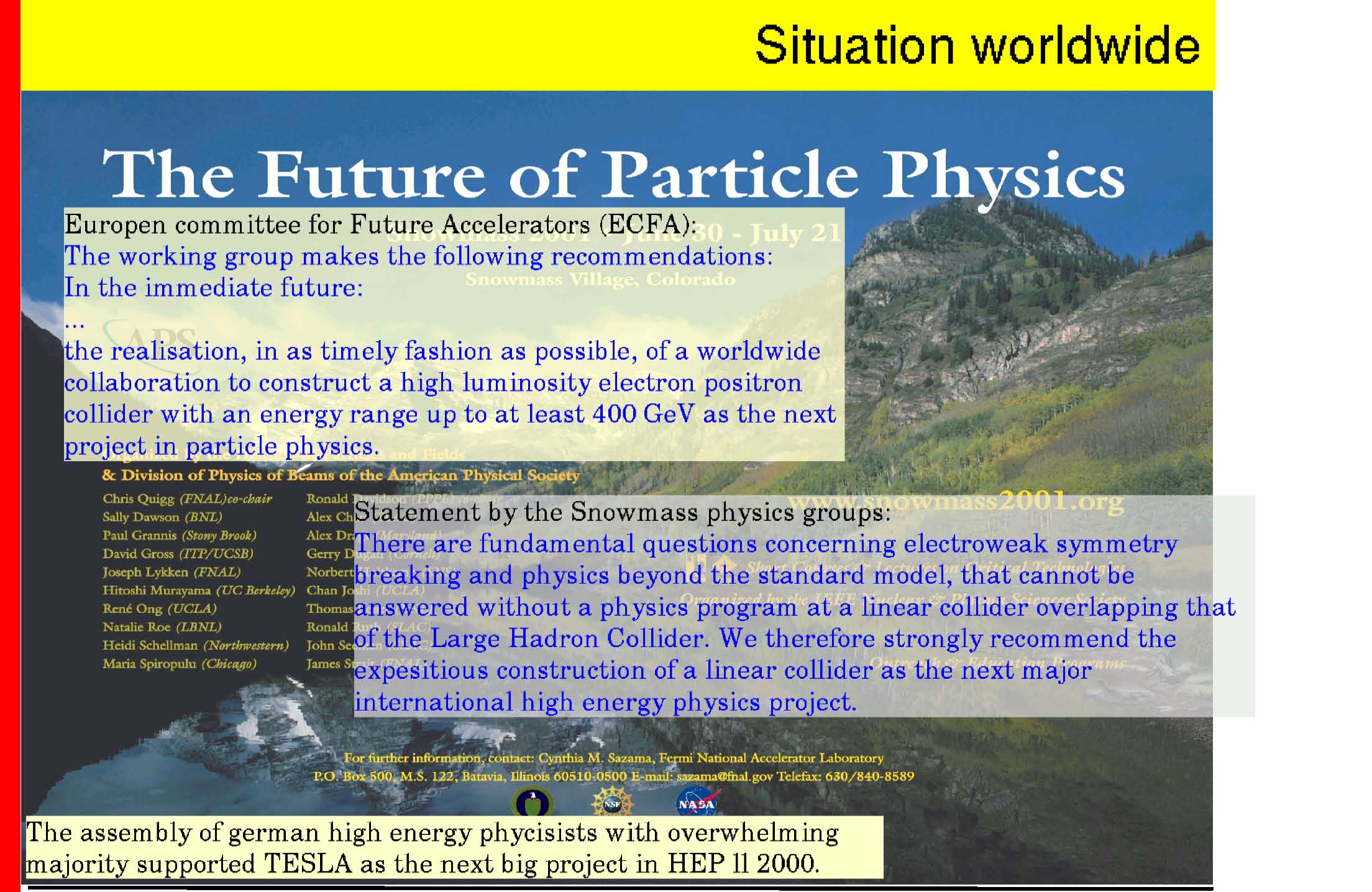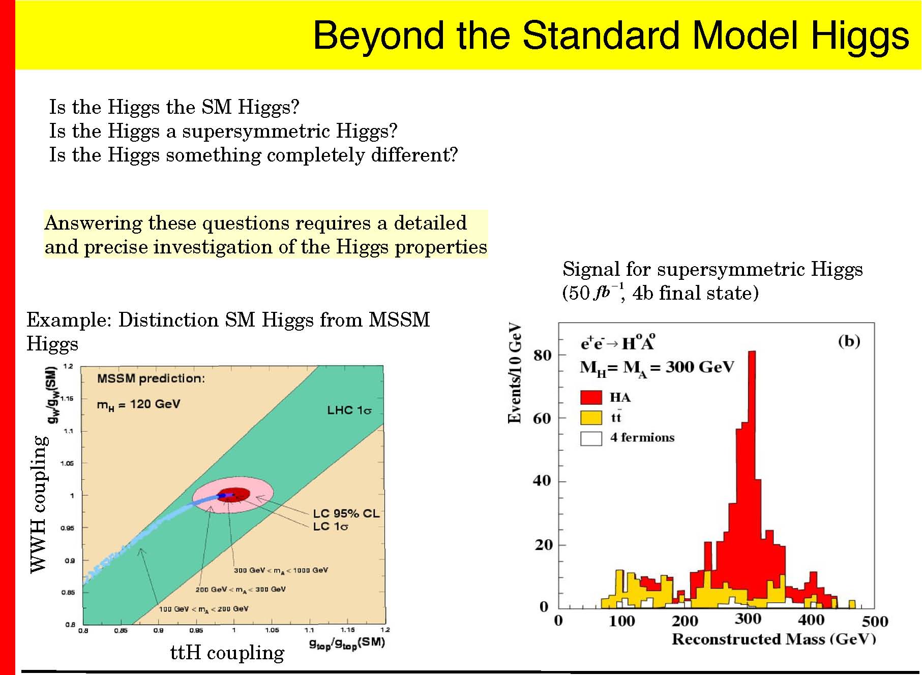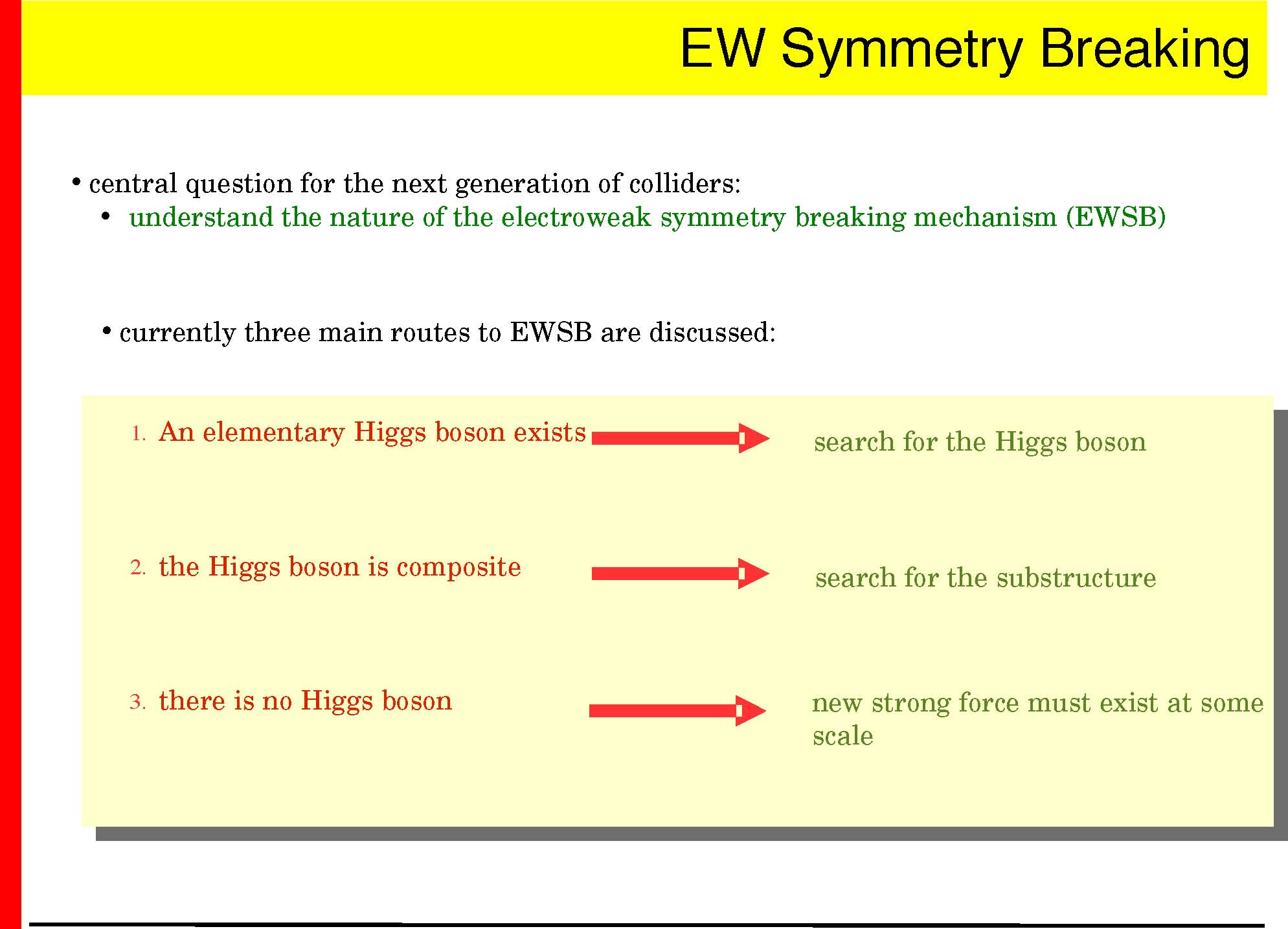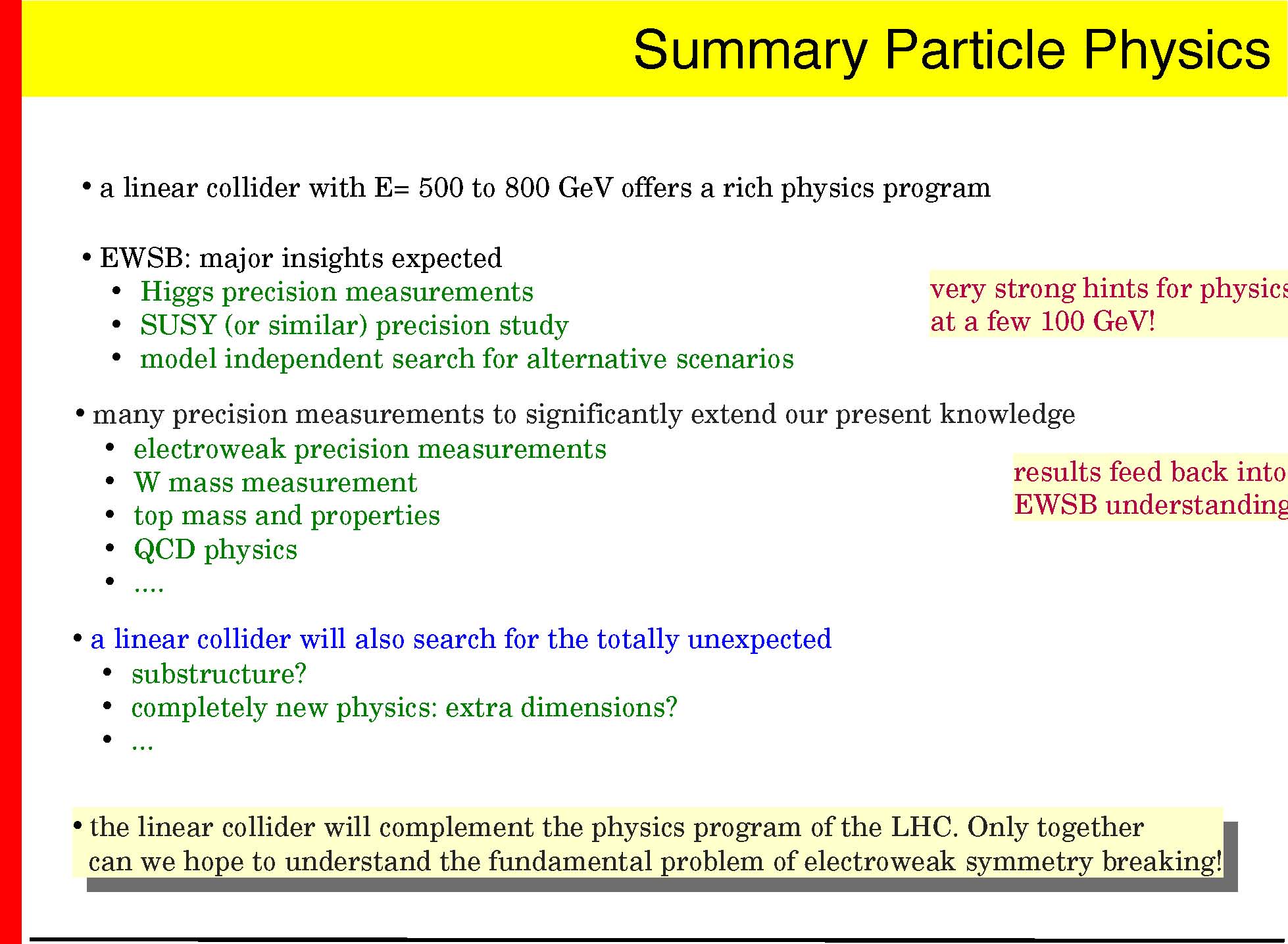 � EWSB: major insights expected � Higgs precision measurements � SUSY (or similar) precision study � model independent search for alternative scenarios